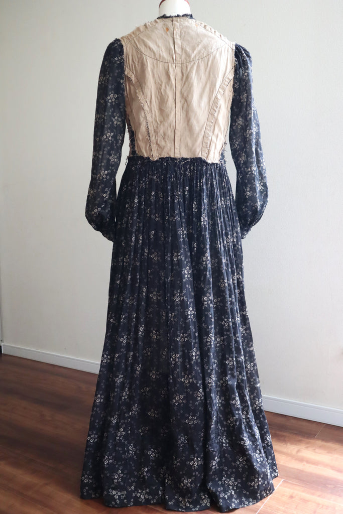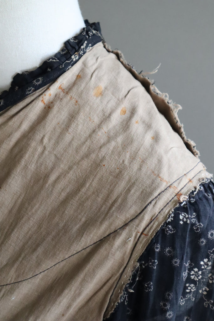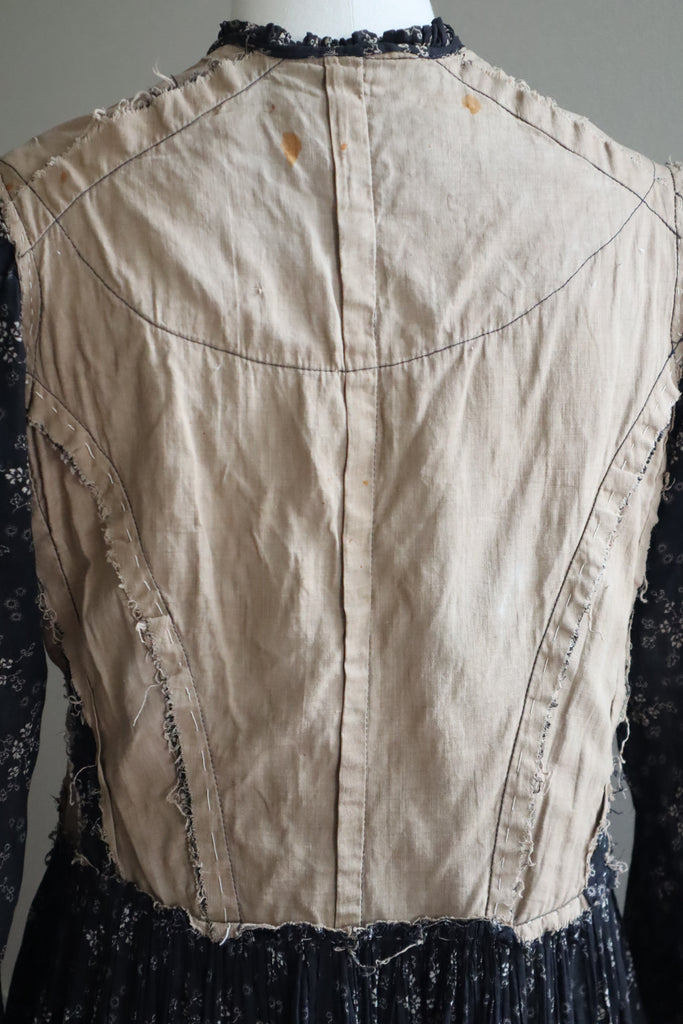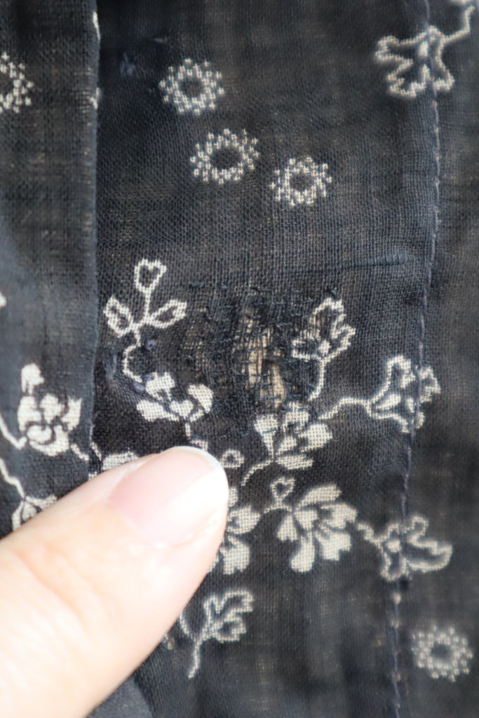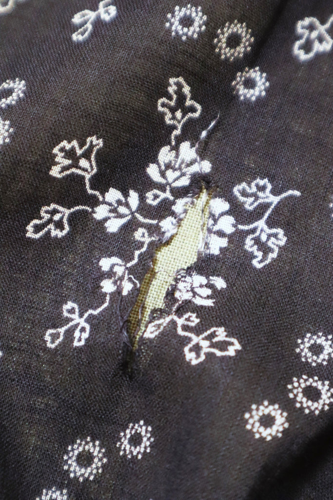 優れた状態。(アンティーク感はございます。ダメージや小穴があります。袖の生地が経年により少し弱くなっており見つけた裂けやすそうな部分は補強しています。その他私による修復が複数、両袖と袖口、裾、襟、身頃など。最後の方の写真に修理の様子などをまとめて載せています。ご確認くださいませ。生地が薄いものなので今後もお修理が必要になってくると思います。年代物とご理解くださいませ。ボディス裏地に経年によるシミなどありますが首の内側や脇下も綺麗な状態です。)