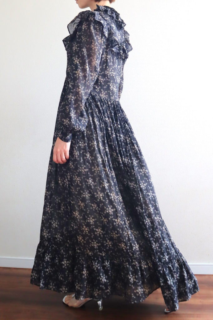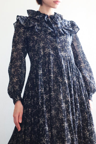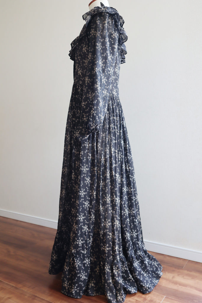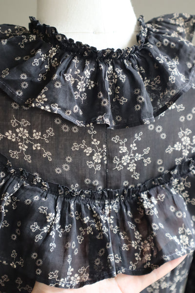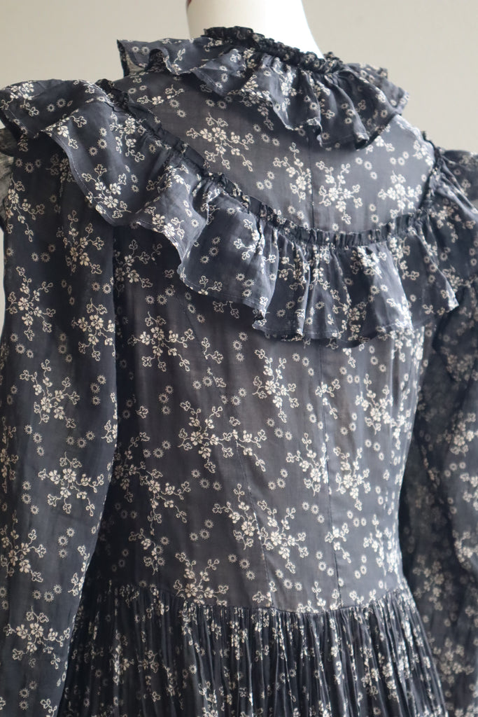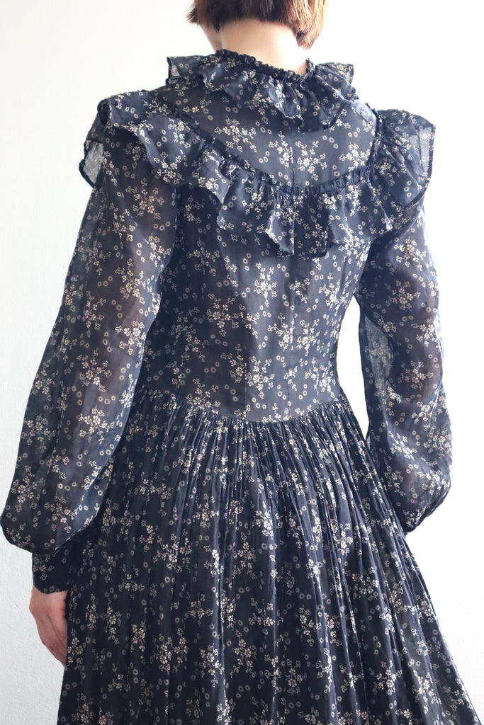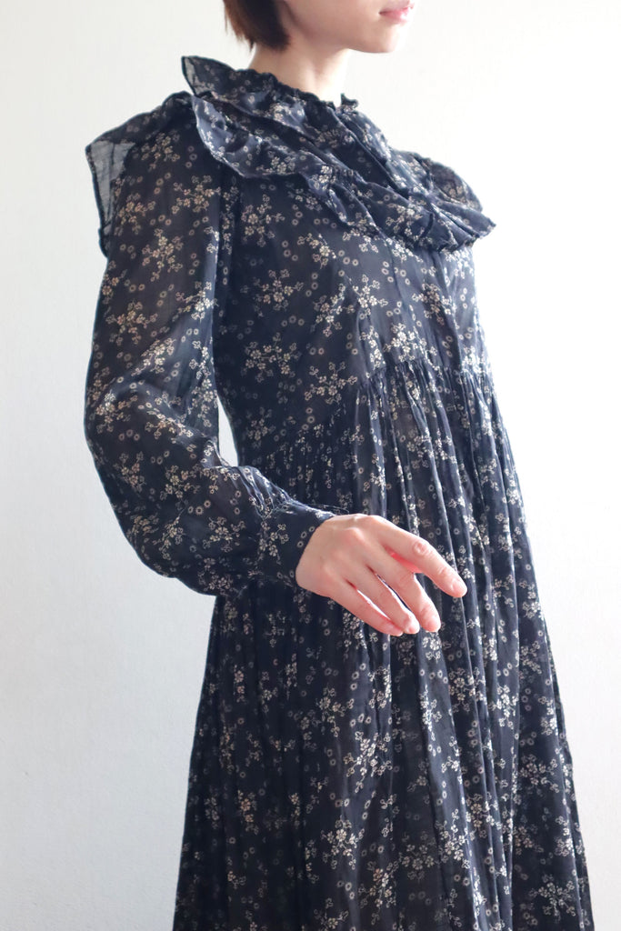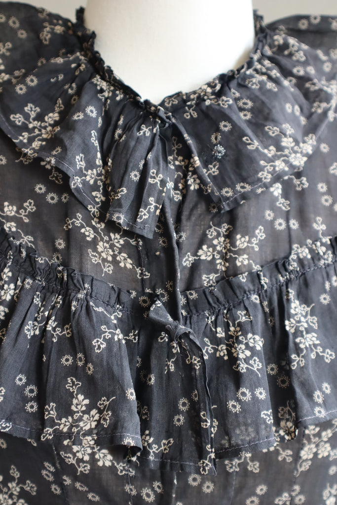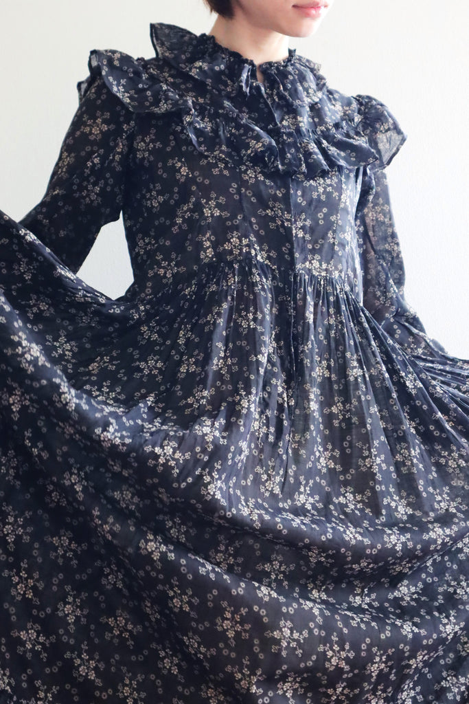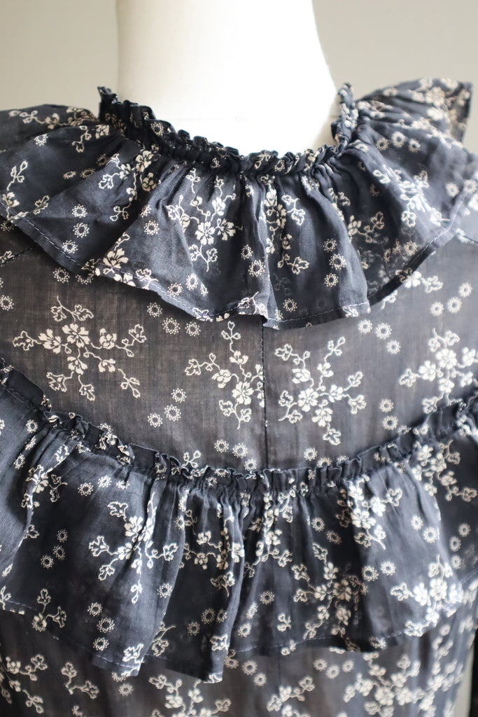フリル付きの丸いヨークに、湾曲した袖のパターンとボタンの袖口でわずかに膨らんだ空気を含むようなシルエット、二重のフラウンス裾。