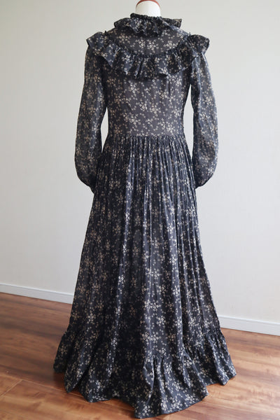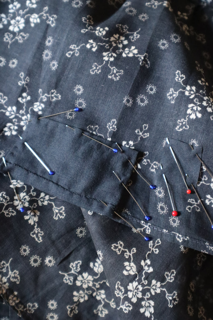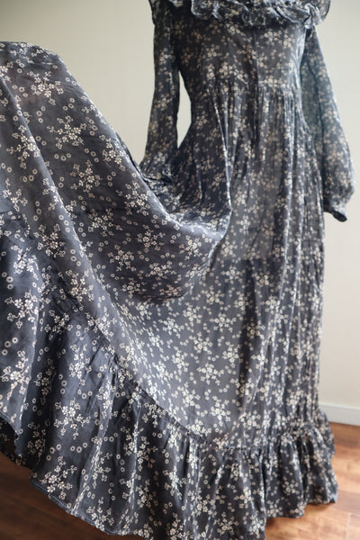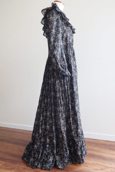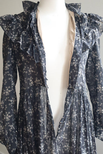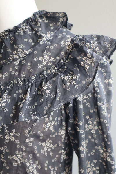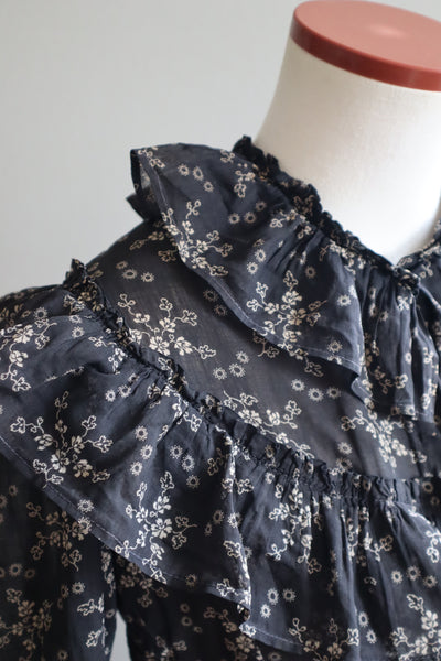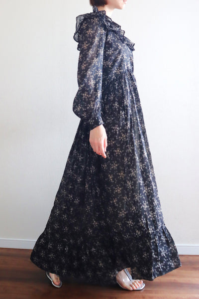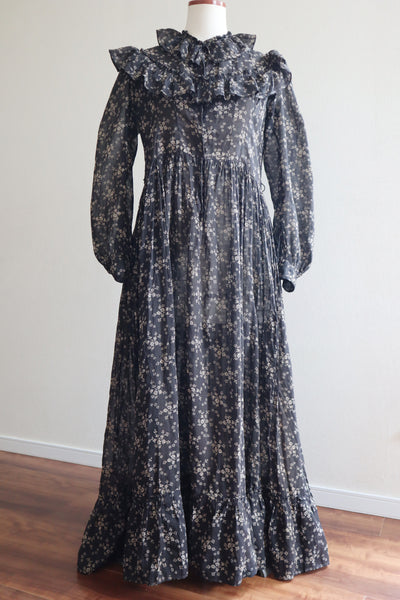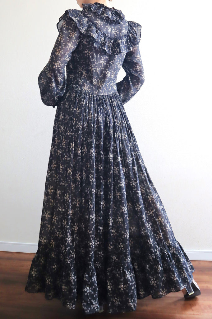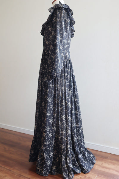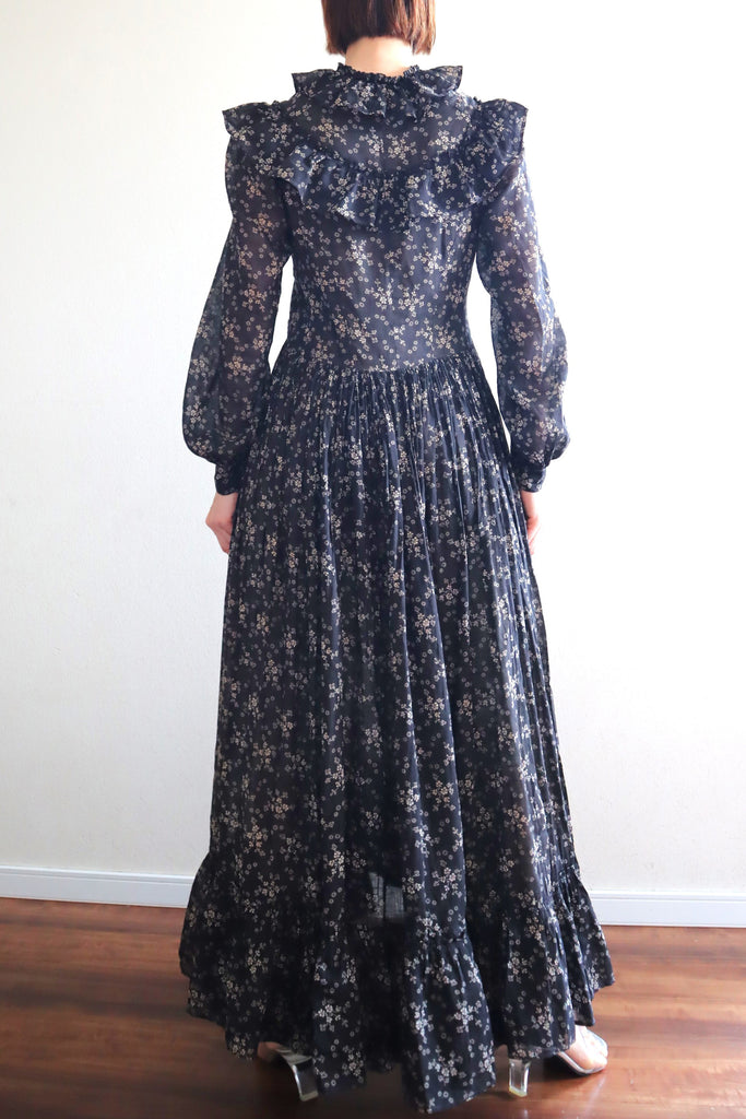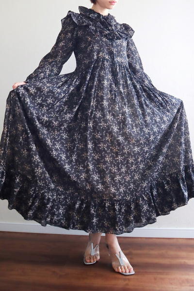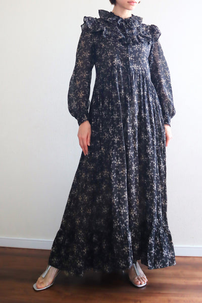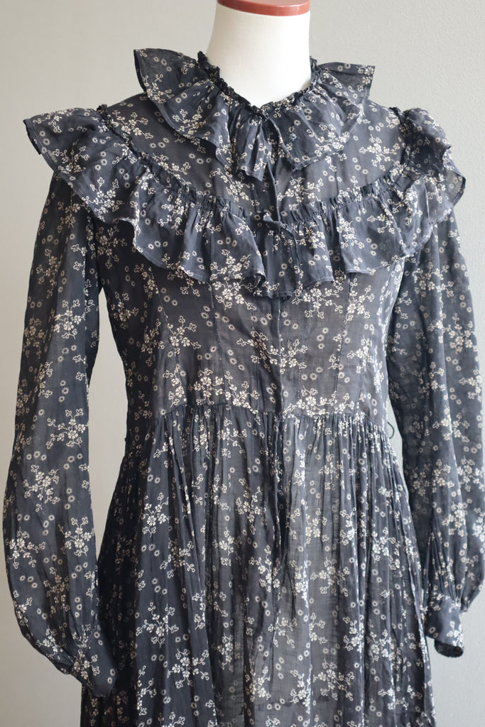 フリル付きの丸いヨークに、湾曲した袖のパターンとボタンの袖口でわずかに膨らんだ空気を含むようなシルエット、二重のフラウンス裾。