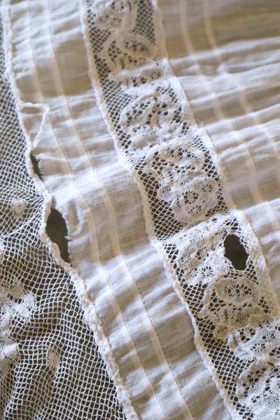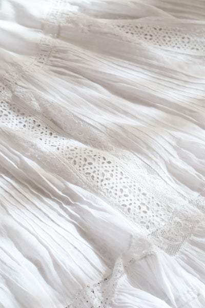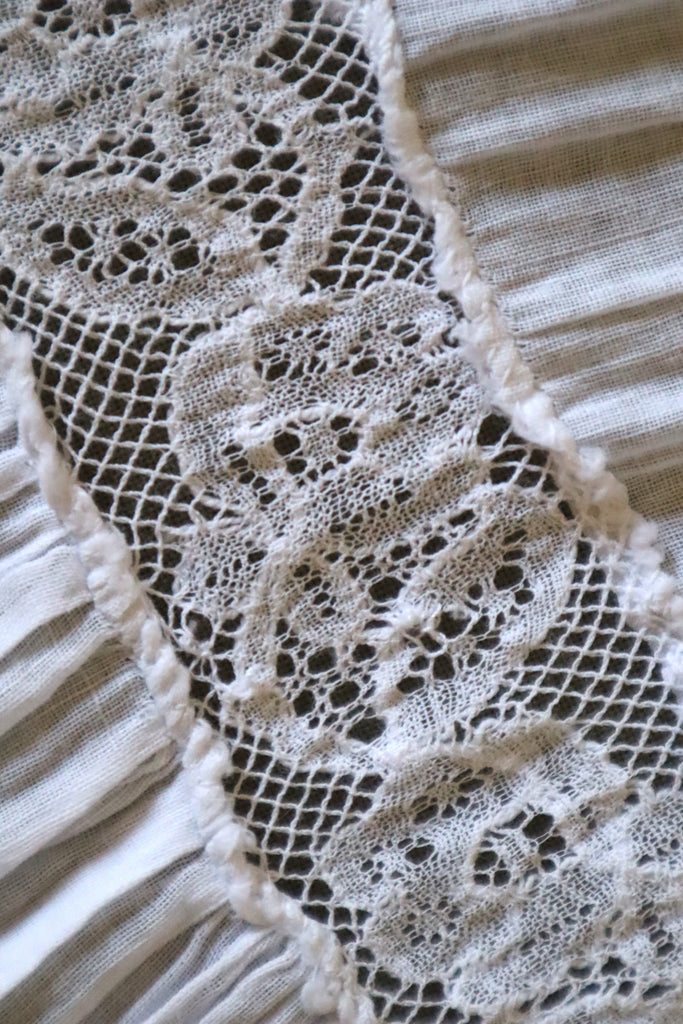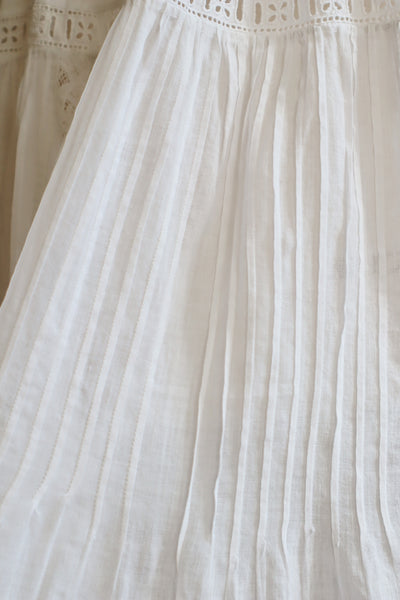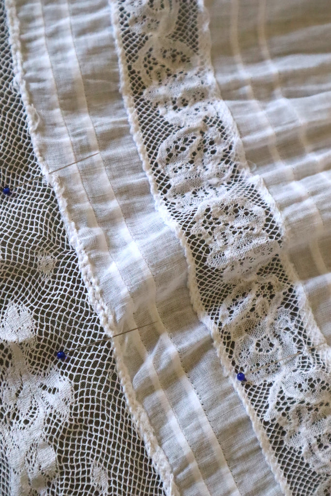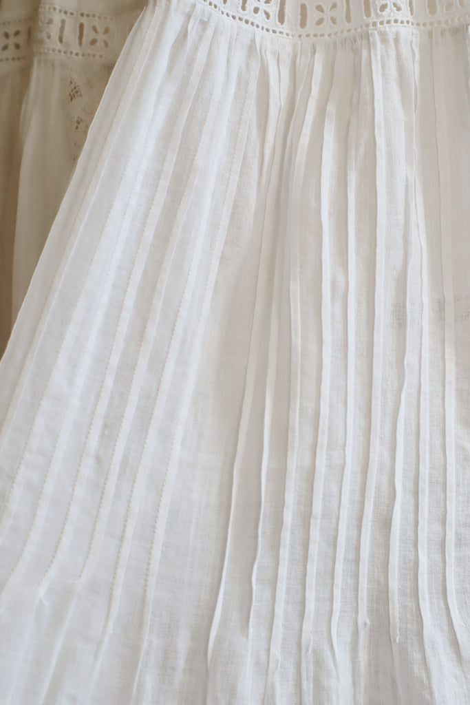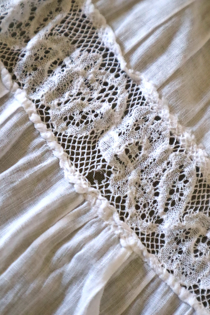 薄いモスリンコットン生地に手作りの美しいレースのインサート、細かなピンタックデザイン。