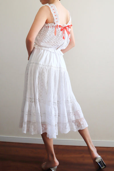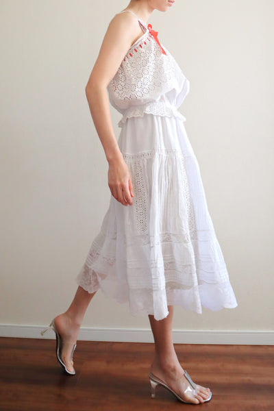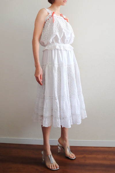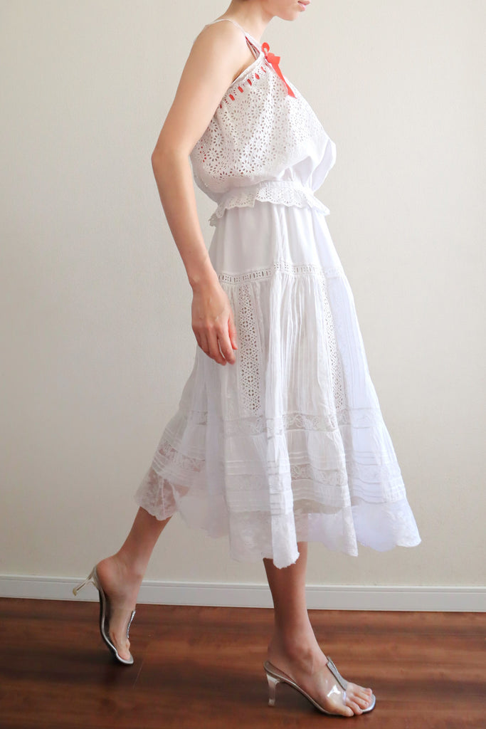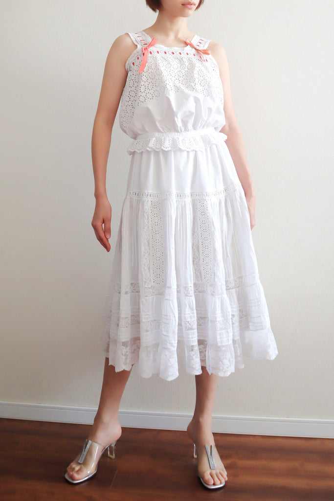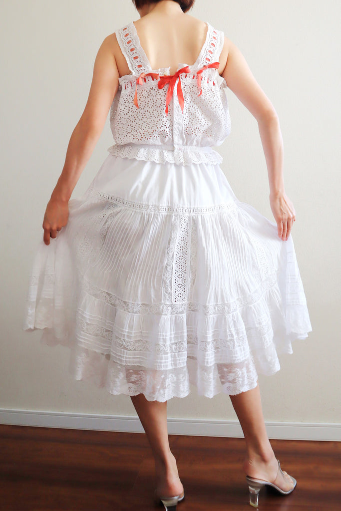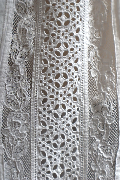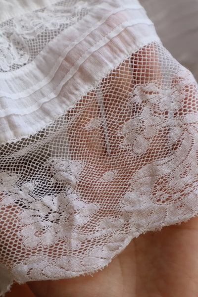 薄いモスリンコットン生地に手作りの美しいレースのインサート、細かなピンタックデザイン。