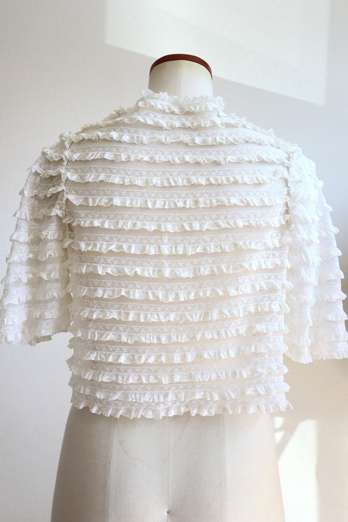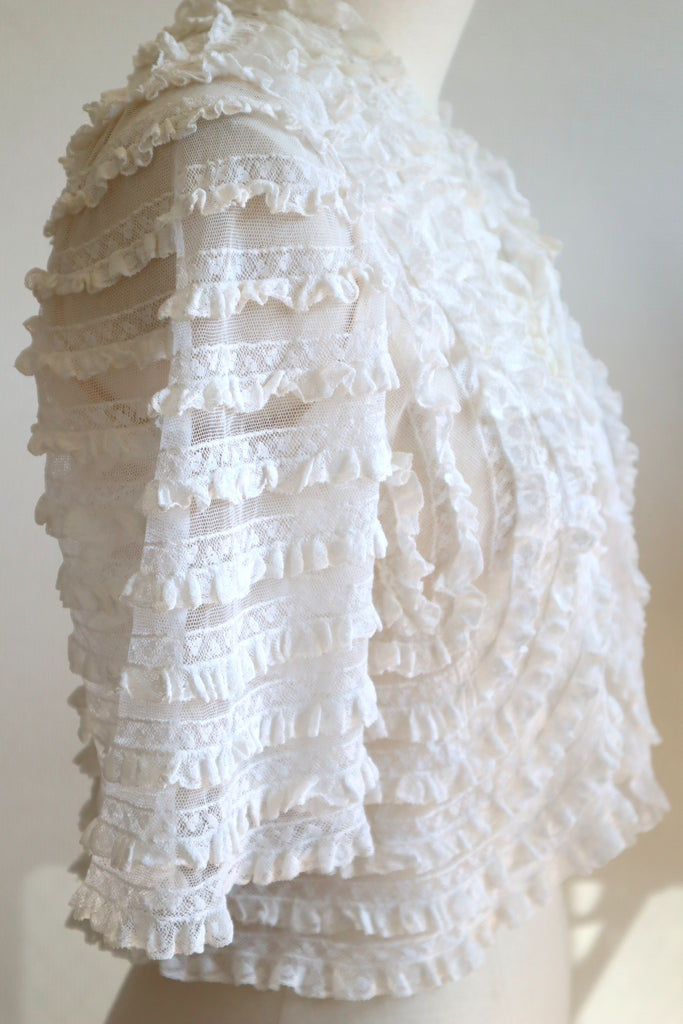 ふりふりと生地寄せされたレースが縫い込まれています。