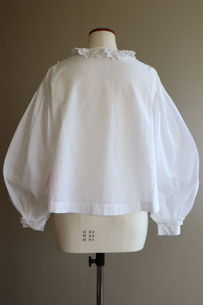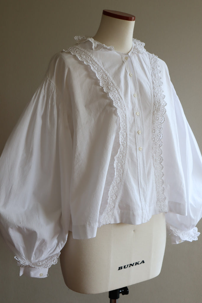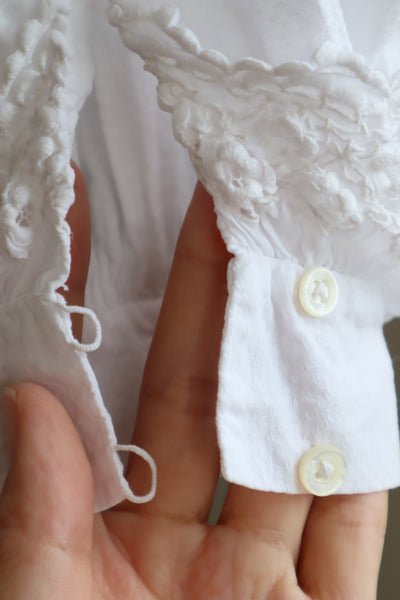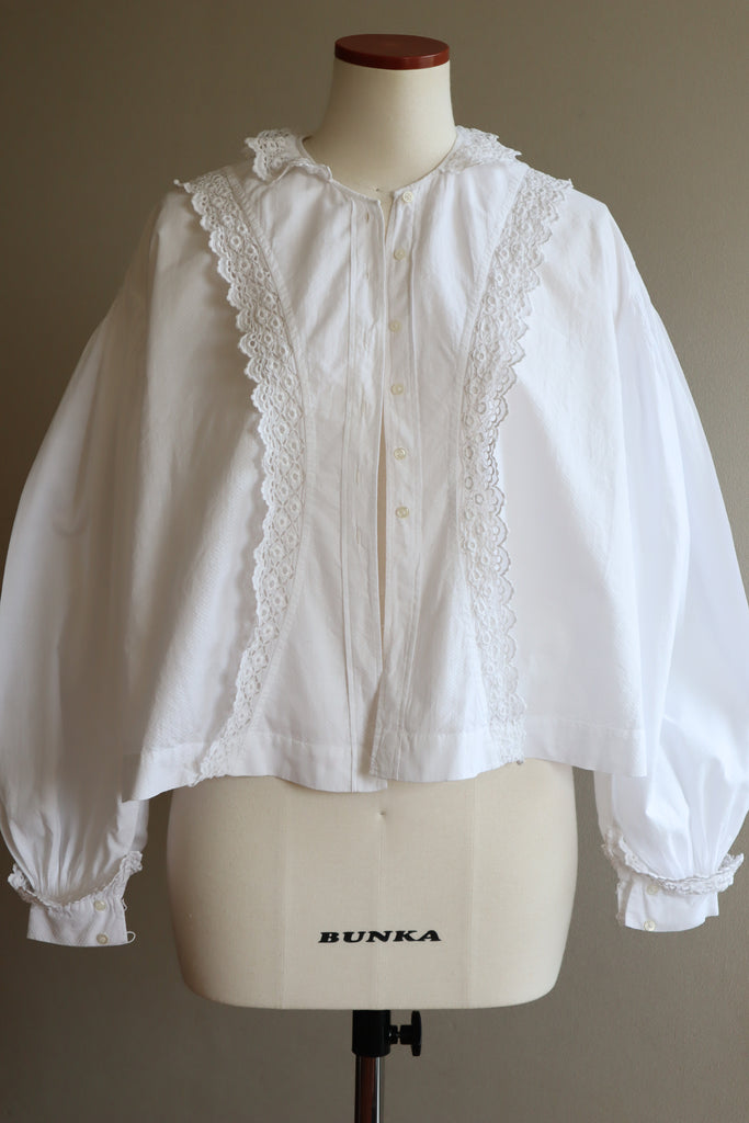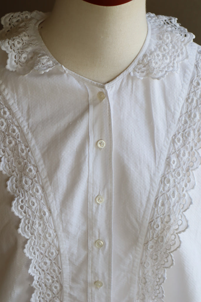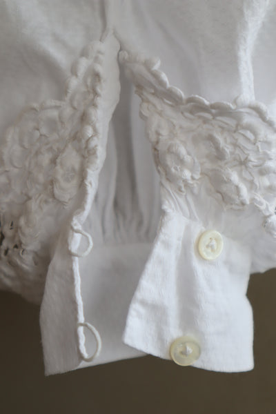 襟と前、袖口に、ふっくらとした立体的な刺繍がされたとても凝ったレースが取り付けてあります。