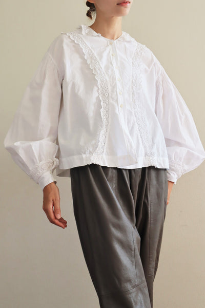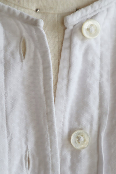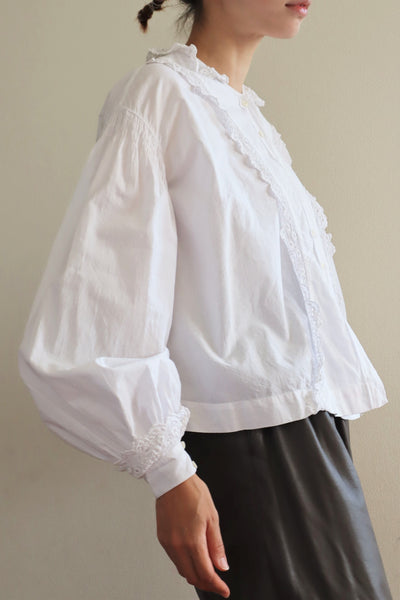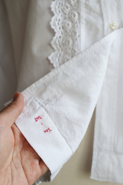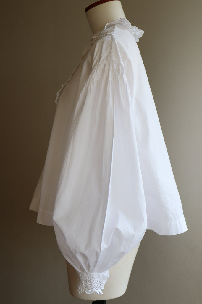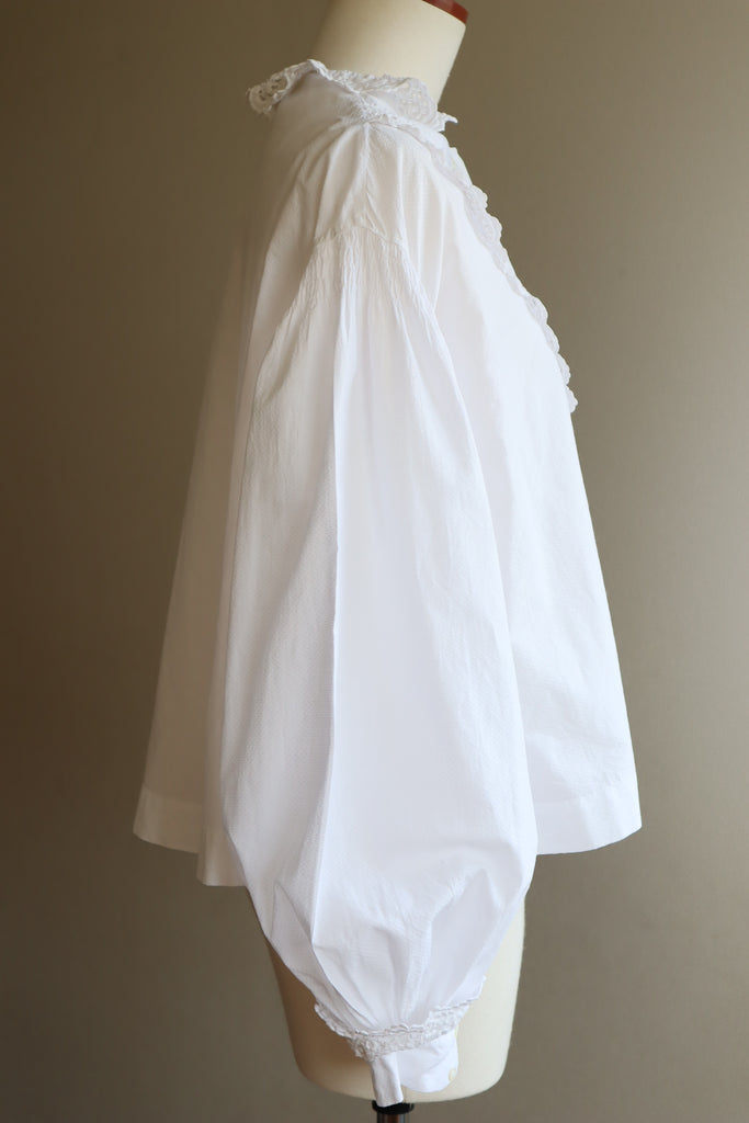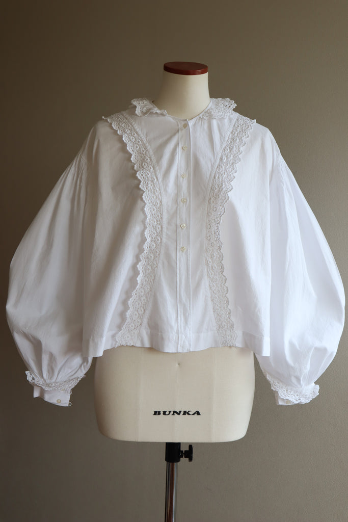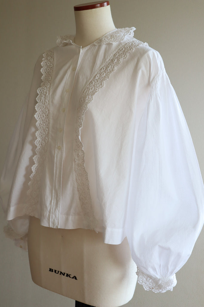 襟と前、袖口に、ふっくらとした立体的な刺繍がされたとても凝ったレースが取り付けてあります。