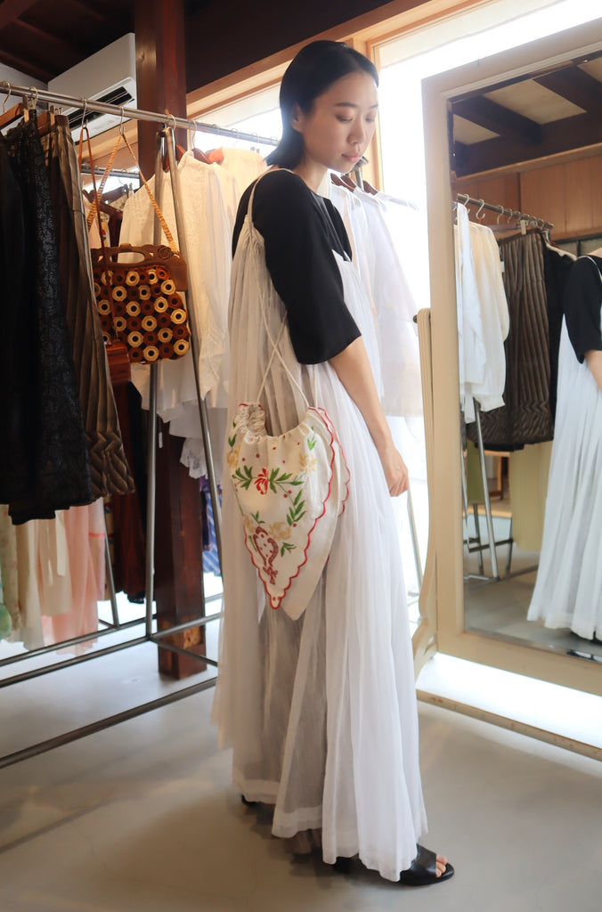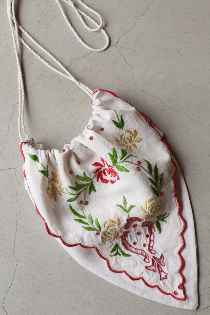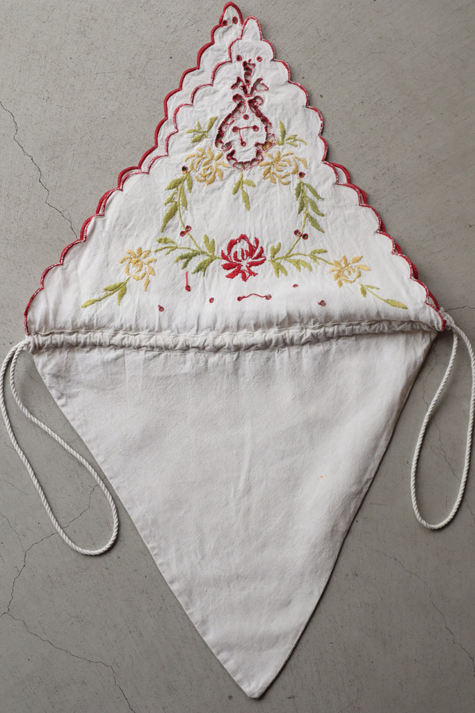 カットワークと花の刺繍、赤いスカラップ刺繍の縁。